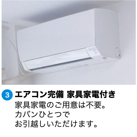 ご契約後は即日ご入居も可能です。家具家電等は取り揃えておりますので、カバン一つでご入居いただけます。